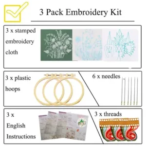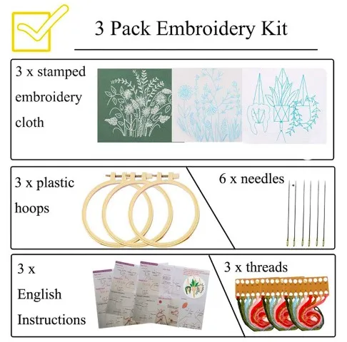 3 x embroidery cloth with pattern, 3 x embroidery hoop, 3 x English instruction, 6 x embroidery needles, colored floss.