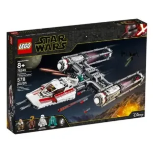 A LEGO Y-wing fighter from Star Wars: The Rise of Skywalker with spring-loaded shooters and bomb-drop function.