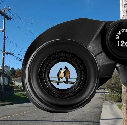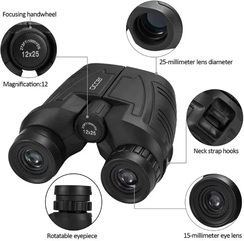 Feature: A real color reproduction, no color distortion under Multi-coated lens. This binoculars can be used for night vision with some light but not for completely dark night. Brighter, not eye strain, with a high transmittance of 99%. Large eyepiece, smooth center and right eye focus knob provides easy yet precise focal adjustment. Two adjustable rotating goggles eyepiece can more focus on the view and more fit for the glasses wearer. Multi-use in hunting, hiking, exploring, viewing, traveling, bird watching, concert, opera, football games, outdoor sports etc. Specifications: Model:12×25 Objective lens diameter: 25mm Eyepiece diameter: 15mm Near focal distance: 5m Exit pupil distance: 20mm Objective lens coating: FMC broadband Focus system: Center and Right eye Prism system: BAK4 Prism Angle of field: 7. 5° Field of view: 273ft/1000yds Weight of binoculars: 0. 65 pounds Item Dimensions: 4.00x 4.40×1.90 inches Waterproof grade: Life waterproof Package included: Binoculars*1 Carrying bag*1 glass cleaning cloth*1 skid-proof rope*1
